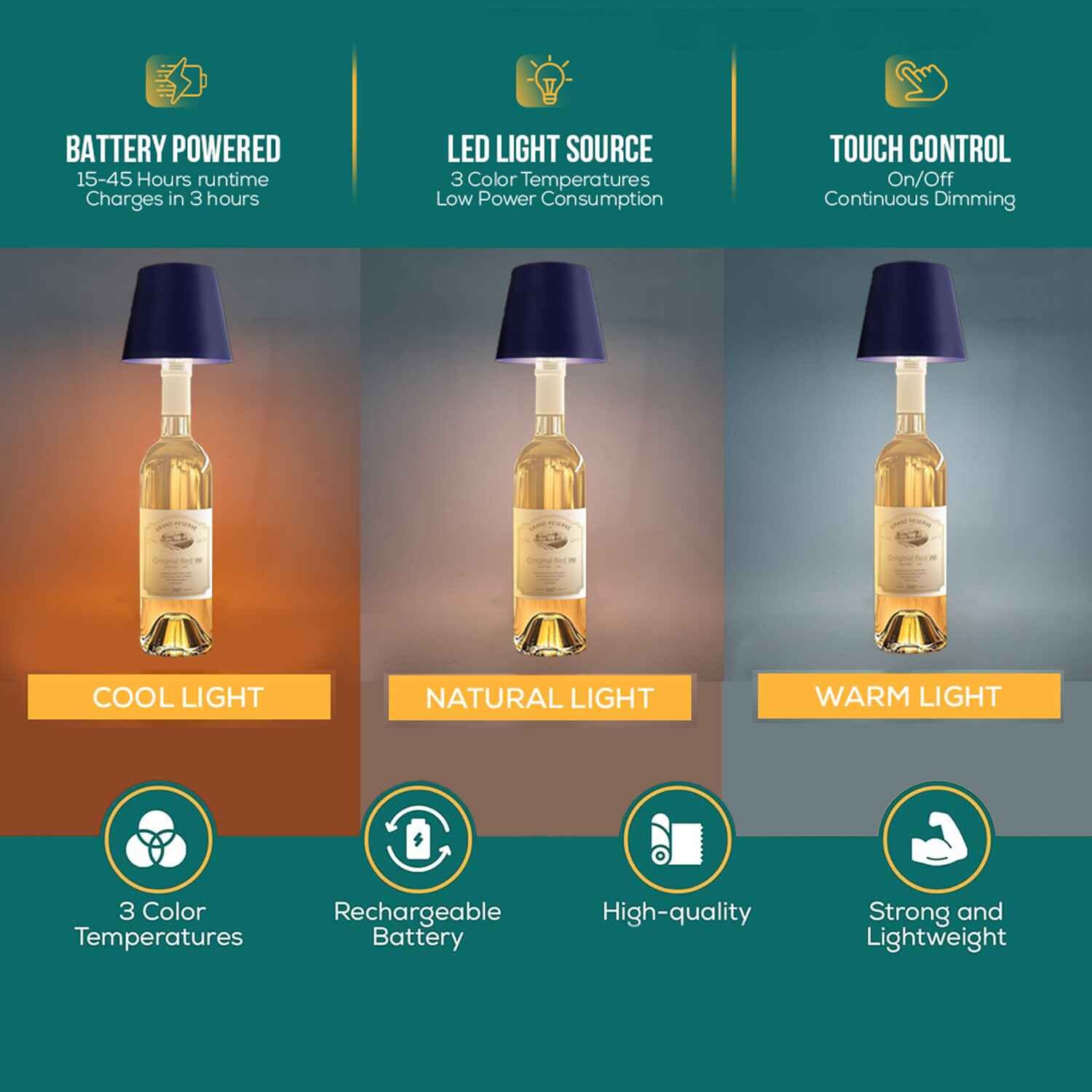 Transform any wine or liquor bottle into a stylish table lamp with this Rechargeable LED Bottle Lamp. Featuring touch control, 3 color temperature modes (3000K–6000K), and adjustable brightness, it’s perfect for indoor and outdoor use. With IP54 waterproof protection, a rechargeable Type-C port, and a sleek aluminum design, this lamp is ideal for dining, parties, patios, and home décor.